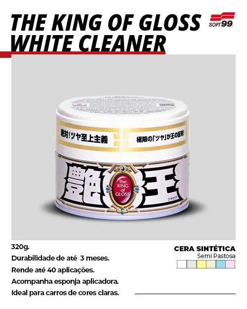 The King of Gloss White é uma cera 100% sintética desenvolvida para carros de cores claras como branco, prata, bege, amarelo etc. Devido ao seu poder limpante, ela é perfeita para remoção de amarelados, encardidos e manchas no verniz.