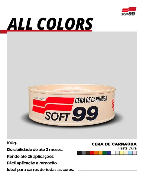 A cera de carnaúba automotiva All Colors foi desenvolvida especialmente para o mercado brasileiro. Ela é do tipo pasta dura e tem ótimo rendimento. A embalagem de 100 gramas faz até 25 enceramentos com alto nível de brilho. Ela pode ser aplicada em todas as cores de veículos. De fácil aplicação, a All Colors proporciona repelência a água e sujeira e protege a superfície da pintura dos raios UV e chuva ácida por até 60 dias.