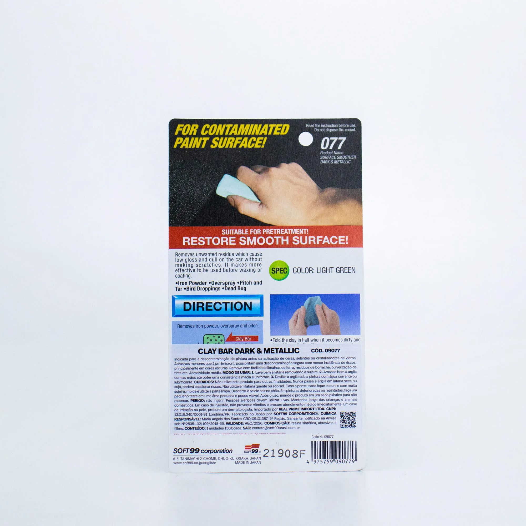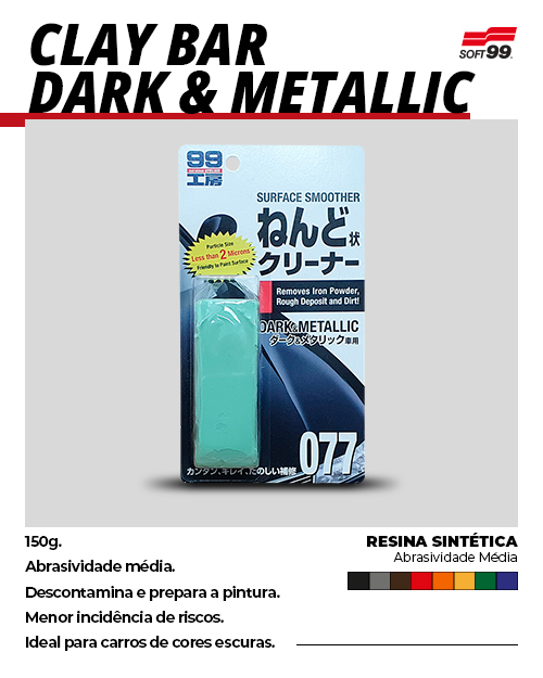 A CLAY BAR DARK & METALLIC é indicada para a descontaminação de pintura antes da aplicação de ceras, selantes ou cristalizadores de vidros. Menos abrasiva, possibilita uma descontaminação segura com menor incidência de riscos, principalmente em carros de cores escuras.