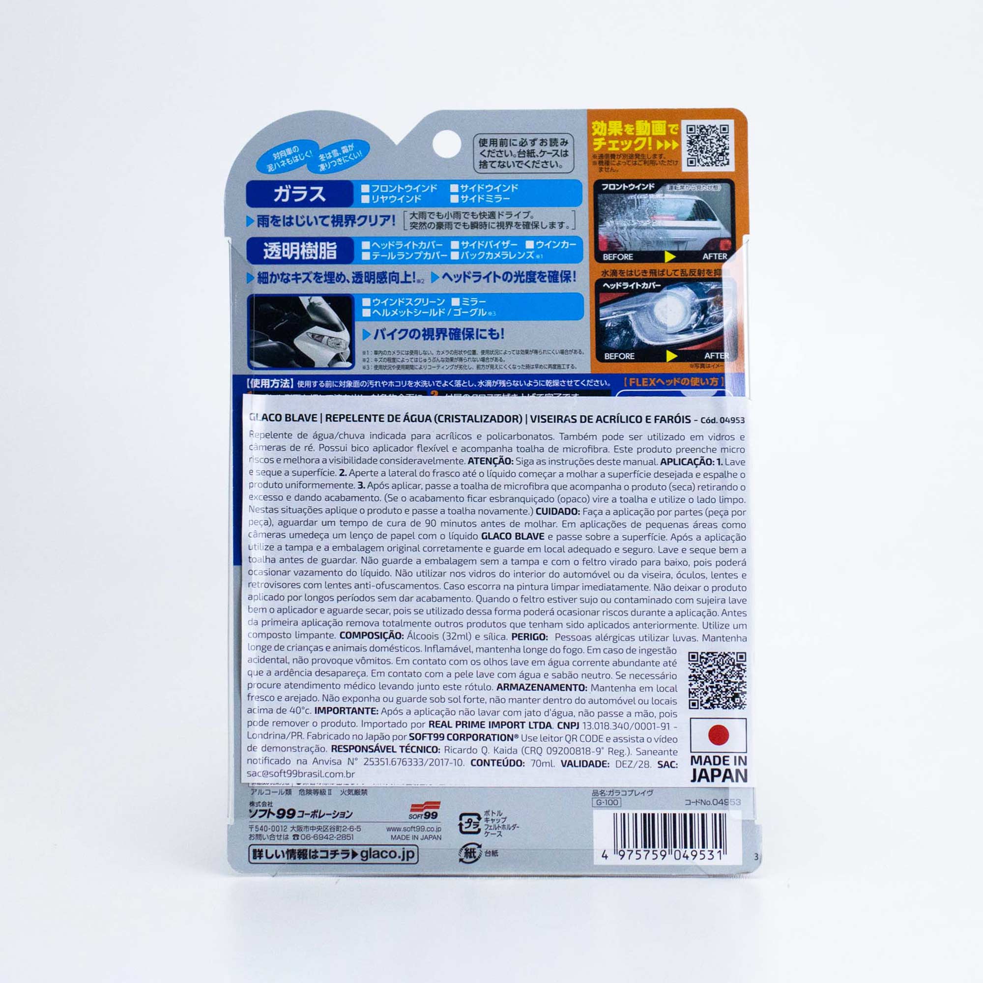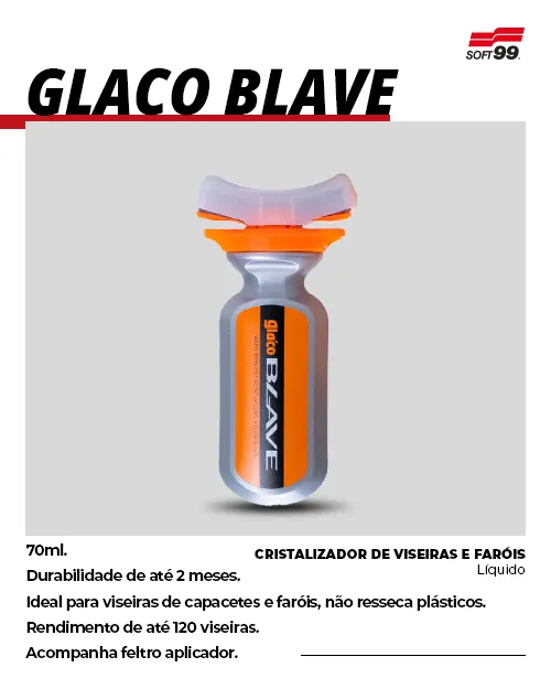 Glaco Blave é produto da linha GLACO indicado para cristalização de plásticos, acrílicos e policarbonatos. Proporciona resultado de repelência acima da média na superfície, melhorando a visibilidade do motorista e garantindo mais segurança ao dirigir. Indicado para viseiras de capacetes, faróis, lanternas traseiras, etc. Pode ser aplicado em aeronaves como helicópteros e aviões. Possui um aplicador embutido que facilita a aplicação, pois se molda tranquilamente a diversos ângulos e superfícies. Glaco Blave pode ser aplicado também em vidros.